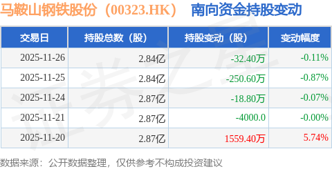 证券之星消息,11月26日南向资金减持32.4万股马鞍山钢铁股份(00323.HK)。近5个交易日中,获南向资金增持的有1天,累计净增持1257.2万股。近20个交易日中,获南向资金增持的有10天,累计净增持1671.2万股。截至目前,南向资金持有马鞍山钢铁股份(00323.HK)2.84亿股,占公司已发行普通股的16.39%。