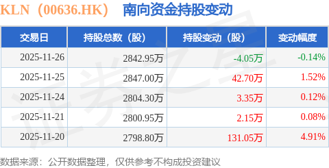 证券之星消息,11月26日南向资金减持4.05万股KLN(00636.HK)。近5个交易日中,获南向资金增持的有4天,累计净增持175.2万股。近20个交易日中,获南向资金增持的有9天,累计净增持4.75万股。截至目前,南向资金持有KLN(00636.HK)2842.95万股,占公司已发行普通股的1.57%。