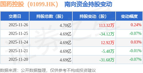 证券之星消息,11月26日南向资金增持113.32万股国药控股(01099.HK)。近5个交易日中,获南向资金增持的有2天,累计净增持54.96万股。近20个交易日中,获南向资金减持的有11天,累计净减持161.53万股。截至目前,南向资金持有国药控股(01099.HK)4.7亿股,占公司已发行普通股的35.0%。