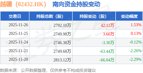 证券之星消息,11月26日南向资金增持42.12万股越疆(02432.HK)。近5个交易日中,获南向资金减持的有3天,累计净减持87.06万股。近20个交易日中,获南向资金增持的有16天,累计净增持406.14万股。截至目前,南向资金持有越疆(02432.HK)2792.1万股,占公司已发行普通股的7.08%。