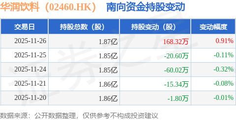 证券之星消息,11月26日南向资金增持168.32万股华润饮料(02460.HK)。近5个交易日中,获南向资金增持的有1天,累计净增持70.56万股。近20个交易日中,获南向资金增持的有9天,累计净增持48.24万股。截至目前,南向资金持有华润饮料(02460.HK)1.87亿股,占公司已发行普通股的7.78%。