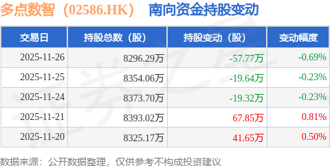 证券之星消息,11月26日南向资金减持57.77万股多点数智(02586.HK)。近5个交易日中,获南向资金增持的有2天,累计净增持12.77万股。近20个交易日中,获南向资金增持的有8天,累计净增持40.89万股。截至目前,南向资金持有多点数智(02586.HK)8296.29万股,占公司已发行普通股的8.84%。