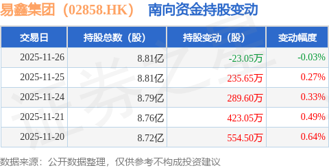 证券之星消息,11月26日南向资金减持23.05万股易鑫集团(02858.HK)。近5个交易日中,获南向资金增持的有4天,累计净增持1479.75万股。近20个交易日中,获南向资金增持的有13天,累计净增持3079.47万股。截至目前,南向资金持有易鑫集团(02858.HK)8.81亿股,占公司已发行普通股的12.97%。