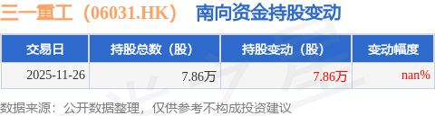 证券之星消息,11月26日南向资金增持7.86万股三一重工(06031.HK)。截至目前,南向资金持有三一重工(06031.HK)7.86万股,占公司已发行普通股的0.0%。