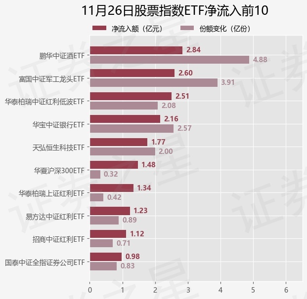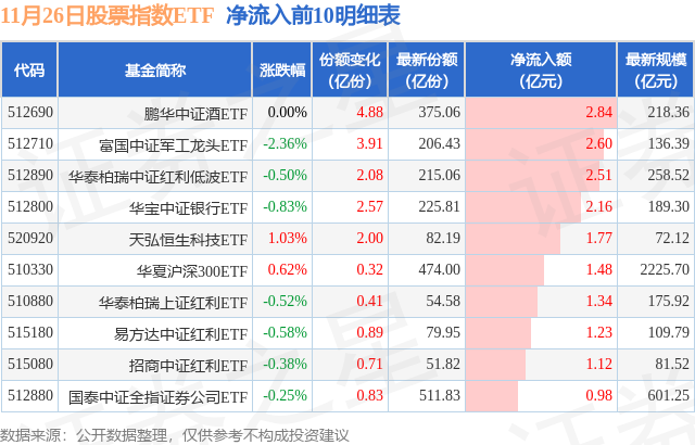当日有115只股票指数ETF基金出现资金净流入,其中净流入排首位的是鹏华中证酒ETF(512690),份额增加了4.88亿份,净流入额为2.84亿元。