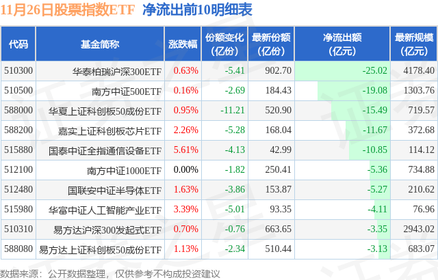 当日有273只股票指数ETF基金出现资金净流出,其中净流出排首位的是华泰柏瑞沪深300ETF(510300),份额减少了5.41亿份,净流出额为25.02亿元。