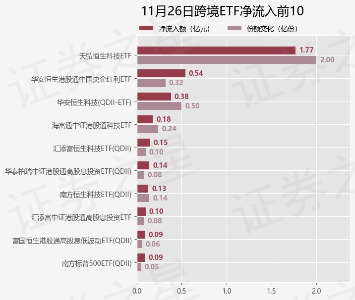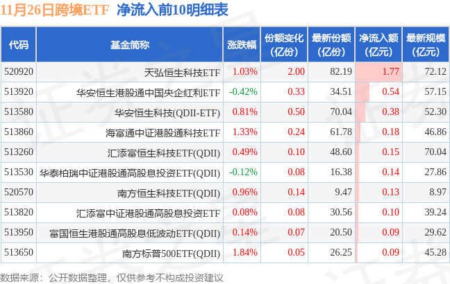 当日有38只跨境ETF基金出现资金净流入,其中净流入排首位的是天弘恒生科技ETF(520920),份额增加了2.0亿份,净流入额为1.77亿元。