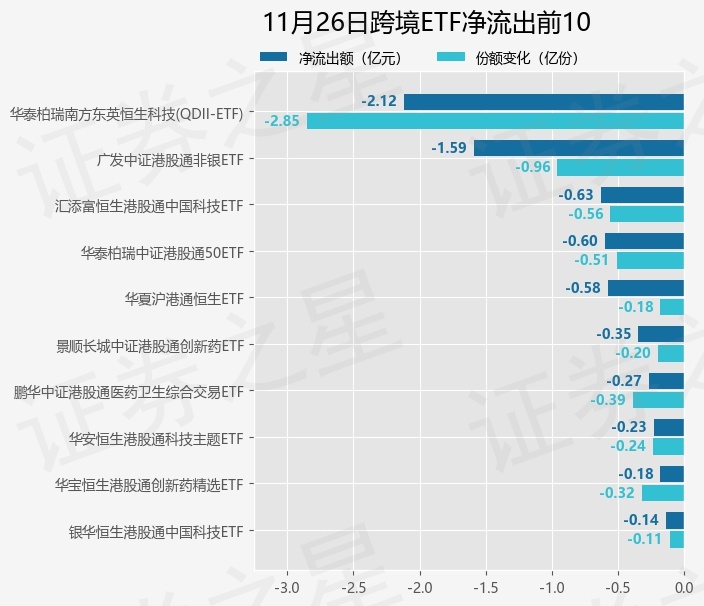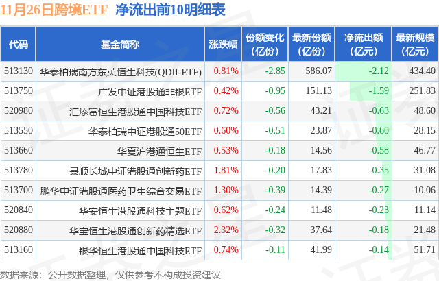 当日有21只跨境ETF基金出现资金净流出,其中净流出排首位的是华泰柏瑞南方东英恒生科技(QDII-ETF)(513130),份额减少了2.85亿份,净流出额为2.12亿元。