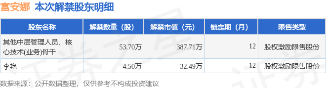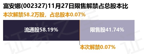 证券之星消息,根据市场公开信息整理,富安娜(002327)于11月27日将有58.2万股限售股份解禁,为公司股权激励限售股份,占公司总股本0.07%。(本次数据根据历史公告整理得出,实际情况以上市公司最新公告为准)最近一年内,该股累计解禁278.49万股,占总股本的0.33%。本次解禁后,公司还有3.5亿股限售股份,占总股本41.74%。具体如下图所示: