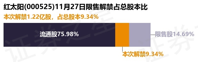 证券之星消息,根据市场公开信息整理,红太阳(000525)于11月27日将有1.22亿股限售股份解禁,为公司其他类型,占公司总股本9.34%。(本次数据根据历史公告整理得出,实际情况以上市公司最新公告为准)本次解禁后,公司还有1.91亿股限售股份,占总股本14.69%。具体如下图所示: