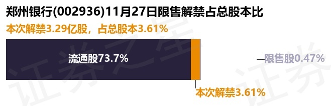证券之星消息,根据市场公开信息整理,郑州银行(002936)于11月27日将有3.29亿股限售股份解禁,为公司定向增发机构配售股份,占公司总股本3.61%。(本次数据根据历史公告整理得出,实际情况以上市公司最新公告为准)本次解禁后,公司还有4233.65万股限售股份,占总股本0.47%。具体如下图所示: