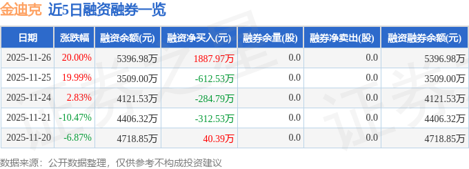 金迪克融资融券信息显示,融资方面,当日融资买入4613.78万元,融资偿还2725.81万元,融资净买入1887.97万元。融券方面,融券卖出0.0股,融券偿还0.0股,融券余量0.0股,融券余额0.0万元。融资融券余额5396.98万元。