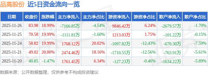 证券之星消息,截至2025年11月26日收盘,品高股份(688227)报收于83.98元,上涨18.99%,换手率17.84%,成交量20.16万手,成交额15.78亿元。