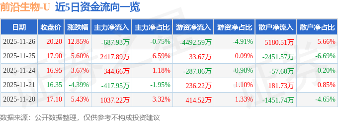证券之星消息,截至2025年11月26日收盘,前沿生物(688221)报收于20.2元,上涨12.85%,换手率12.16%,成交量45.55万手,成交额9.16亿元。