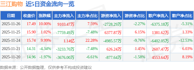 证券之星消息,截至2025年11月26日收盘,三江购物(601116)报收于17.49元,上涨10.0%,涨停,换手率13.31%,成交量72.92万手,成交额12.0亿元。