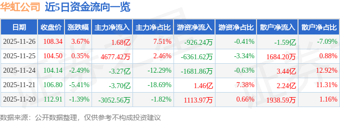 证券之星消息,截至2025年11月26日收盘,华虹公司(688347)报收于108.34元,上涨3.67%,换手率5.1%,成交量20.8万手,成交额22.42亿元。
