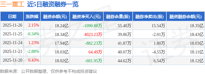 三一重工融资融券信息显示,融资方面,当日融资买入5494.38万元,融资偿还6585.26万元,融资净偿还1090.88万元。融券方面,融券卖出16.59万股,融券偿还1.05万股,融券余量55.4万股,融券余额1156.75万元。融资融券余额18.35亿元。