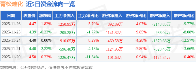 证券之星消息,截至2025年11月26日收盘,青松建化(600425)报收于4.47元,上涨1.82%,换手率3.53%,成交量48.62万手,成交额2.19亿元。