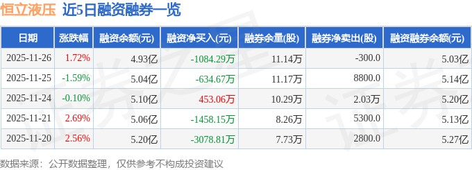 恒立液压融资融券信息显示,融资方面,当日融资买入3854.54万元,融资偿还4938.84万元,融资净偿还1084.29万元。融券方面,融券卖出1700.0股,融券偿还2000.0股,融券余量11.14万股,融券余额1026.83万元。融资融券余额5.03亿元。