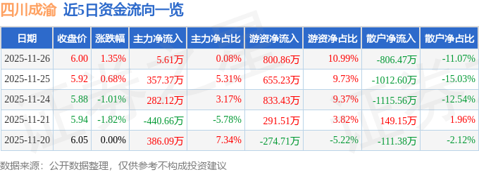 11月26日的资金流向数据方面,主力资金净流入5.61万元,占总成交额0.08%,游资资金净流入800.86万元,占总成交额10.99%,散户资金净流出806.47万元,占总成交额11.07%。