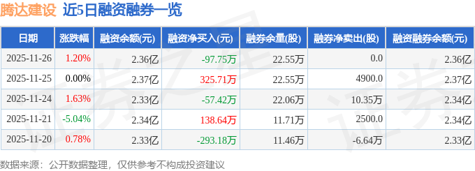 腾达建设融资融券信息显示,融资方面,当日融资买入627.75万元,融资偿还725.49万元,融资净偿还97.75万元。融券方面,融券卖出0.0股,融券偿还0.0股,融券余量22.55万股,融券余额56.83万元。融资融券余额2.36亿元。