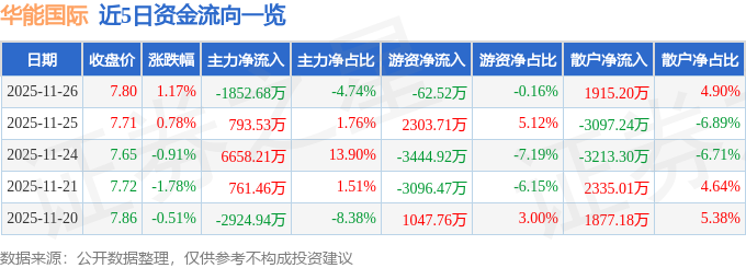证券之星消息,截至2025年11月26日收盘,华能国际(600011)报收于7.8元,上涨1.17%,换手率0.46%,成交量50.24万手,成交额3.91亿元。