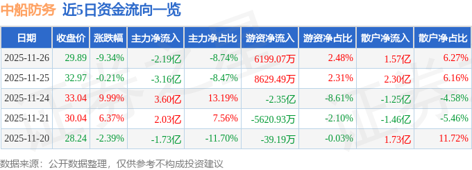 证券之星消息,截至2025年11月26日收盘,中船防务(600685)报收于29.89元,下跌9.34%,换手率10.13%,成交量83.22万手,成交额25.03亿元。