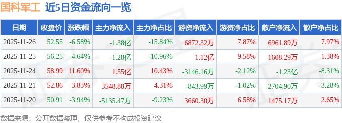 证券之星消息,截至2025年11月26日收盘,国科军工(688543)报收于52.55元,下跌6.58%,换手率14.14%,成交量16.39万手,成交额8.73亿元。