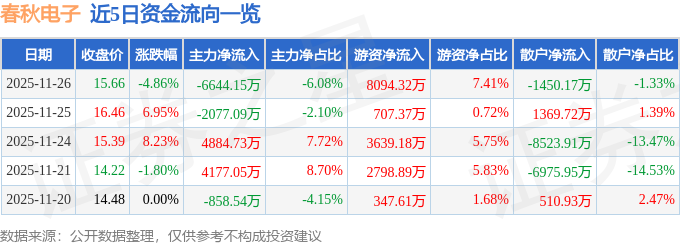 证券之星消息,截至2025年11月26日收盘,春秋电子(603890)报收于15.66元,下跌4.86%,换手率15.4%,成交量70.2万手,成交额10.93亿元。