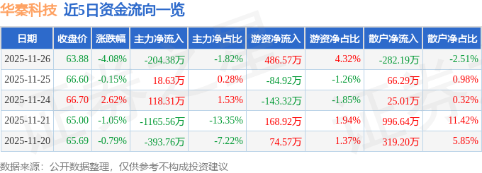 证券之星消息,截至2025年11月26日收盘,华秦科技(688281)报收于63.88元,下跌4.08%,换手率0.64%,成交量1.73万手,成交额1.13亿元。