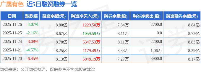 广晟有色融资融券信息显示,融资方面,当日融资买入5959.35万元,融资偿还4729.85万元,融资净买入1229.5万元。融券方面,融券卖出0.0股,融券偿还2700.0股,融券余量7.84万股,融券余额411.91万元。融资融券余额8.84亿元。