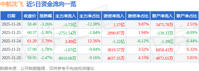 证券之星消息,截至2025年11月26日收盘,中航沈飞(600760)报收于58.4元,下跌3.26%,换手率0.86%,成交量23.68万手,成交额13.87亿元。