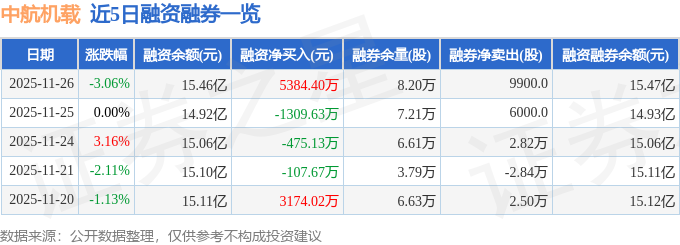 中航机载融资融券信息显示,融资方面,当日融资买入1.12亿元,融资偿还5802.83万元,融资净买入5384.4万元。融券方面,融券卖出1.59万股,融券偿还6000.0股,融券余量8.2万股,融券余额98.73万元。融资融券余额15.47亿元。