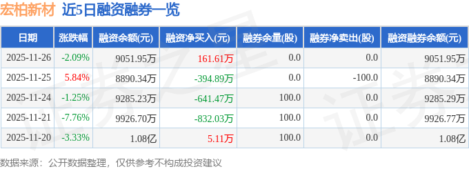 宏柏新材融资融券信息显示,融资方面,当日融资买入1286.19万元,融资偿还1124.58万元,融资净买入161.61万元。融券方面,融券卖出0.0股,融券偿还0.0股,融券余量0.0股,融券余额0.0万元。融资融券余额9051.95万元。