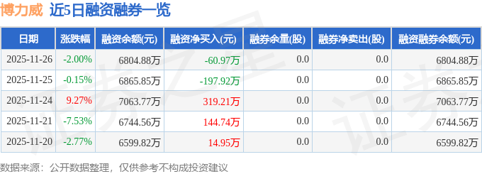 博力威融资融券信息显示,融资方面,当日融资买入460.08万元,融资偿还521.06万元,融资净偿还60.97万元。融券方面,融券卖出0.0股,融券偿还0.0股,融券余量0.0股,融券余额0.0万元。融资融券余额6804.88万元。