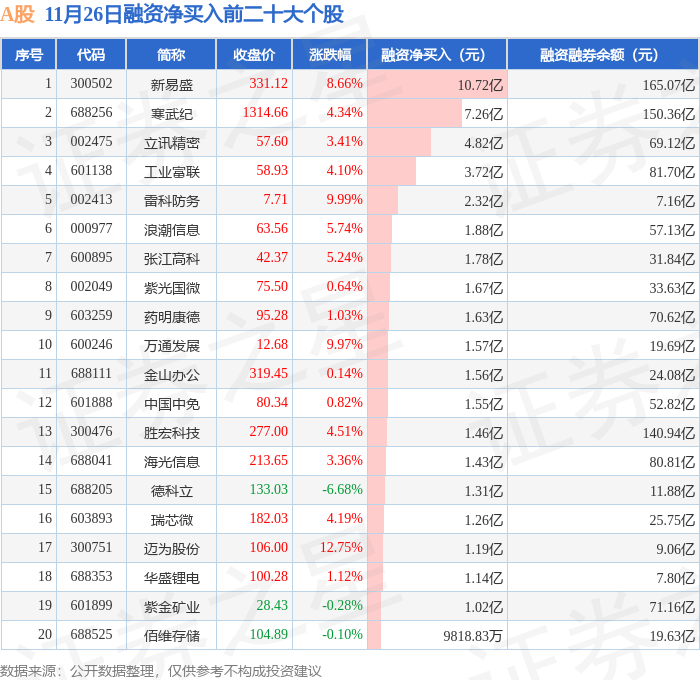 A股融资净买入前三分别为:新易盛(300502)融资净买入10.72亿元、寒武纪(688256)融资净买入7.26亿元、立讯精密(002475)融资净买入4.82亿元,前20具体见下表: