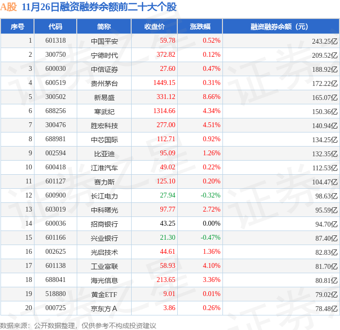 A股融资融券余额前三分别为:中国平安(601318)融资融券余额243.25亿元、宁德时代(300750)融资融券余额209.52亿元、中信证券(600030)融资融券余额188.92亿元,前20具体见下表: