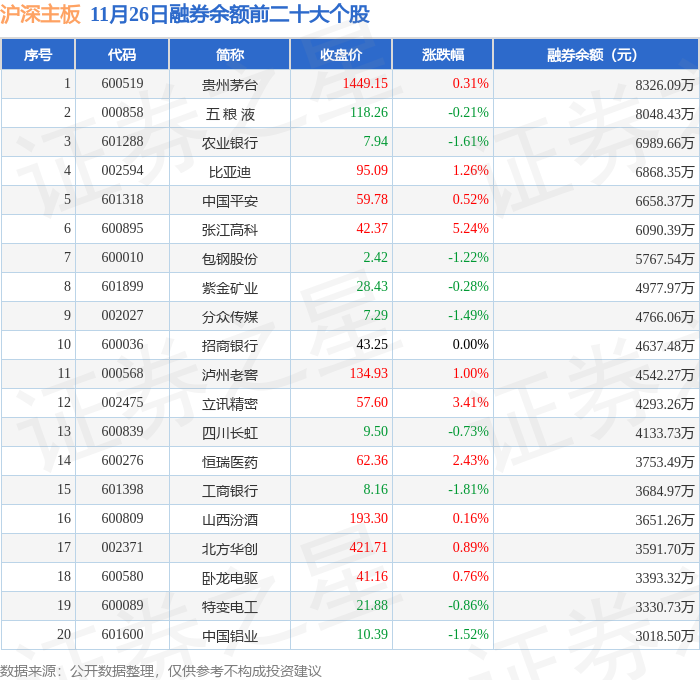 沪深主板融券余额前三分别为:贵州茅台(600519)融券余额8326.09万元、五 粮 液(000858)融券余额8048.43万元、农业银行(601288)融券余额6989.66万元,前20具体见下表: