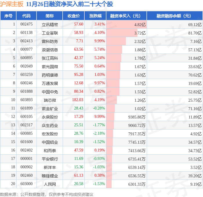沪深主板融资净买入前三分别为:立讯精密(002475)融资净买入4.82亿元、工业富联(601138)融资净买入3.72亿元、雷科防务(002413)融资净买入2.32亿元,前20具体见下表: