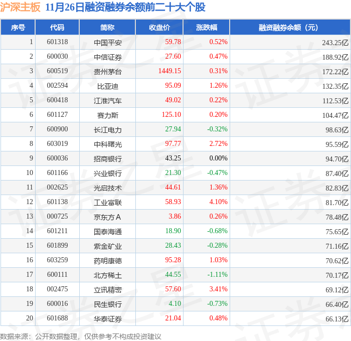 沪深主板融资融券余额前三分别为:中国平安(601318)融资融券余额243.25亿元、中信证券(600030)融资融券余额188.92亿元、贵州茅台(600519)融资融券余额172.22亿元,前20具体见下表: