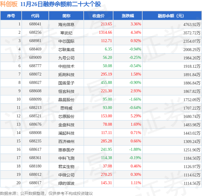科创板融券余额前三分别为:海光信息(688041)融券余额4763.92万元、寒武纪(688256)融券余额3572.72万元、中芯国际(688981)融券余额2354.07万元,前20具体见下表: