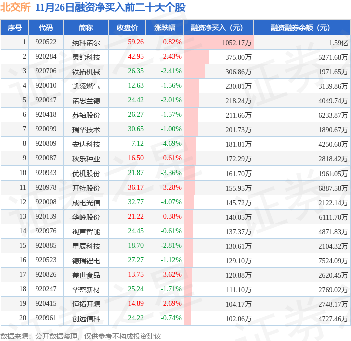 北交所融资净买入前三分别为:纳科诺尔(920522)融资净买入1052.17万元、灵鸽科技(920284)融资净买入375万元、铁拓机械(920706)融资净买入306.86万元,前20具体见下表: