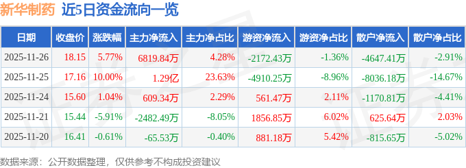 证券之星消息,截至2025年11月26日收盘,新华制药(000756)报收于18.15元,上涨5.77%,换手率17.82%,成交量87.79万手,成交额15.95亿元。