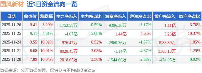 证券之星消息,截至2025年11月26日收盘,国风新材(000859)报收于9.41元,上涨3.29%,换手率35.06%,成交量314.13万手,成交额29.61亿元。