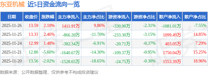 证券之星消息,截至2025年11月26日收盘,东亚机械(301028)报收于13.59元,上涨2.1%,换手率4.19%,成交量10.41万手,成交额1.43亿元。