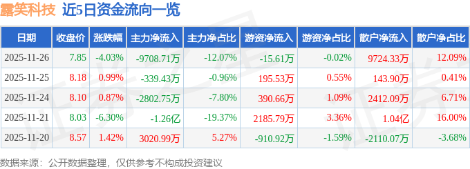证券之星消息,截至2025年11月26日收盘,露笑科技(002617)报收于7.85元,下跌4.03%,换手率5.41%,成交量102.27万手,成交额8.05亿元。