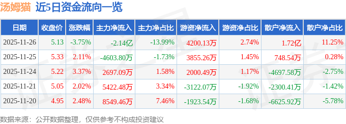 证券之星消息,截至2025年11月26日收盘,汤姆猫(300459)报收于5.13元,下跌3.75%,换手率8.97%,成交量294.98万手,成交额15.32亿元。