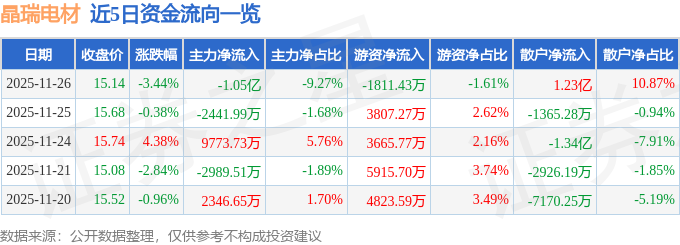 11月26日的资金流向数据方面,主力资金净流出1.05亿元,占总成交额9.27%,游资资金净流出1811.43万元,占总成交额1.61%,散户资金净流入1.23亿元,占总成交额10.87%。