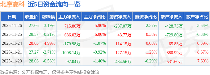 证券之星消息,截至2025年11月26日收盘,北摩高科(002985)报收于27.66元,下跌3.19%,换手率2.47%,成交量4.34万手,成交额1.21亿元。