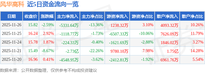 证券之星消息,截至2025年11月26日收盘,风华高科(000636)报收于15.82元,下跌2.59%,换手率2.16%,成交量24.97万手,成交额3.99亿元。
